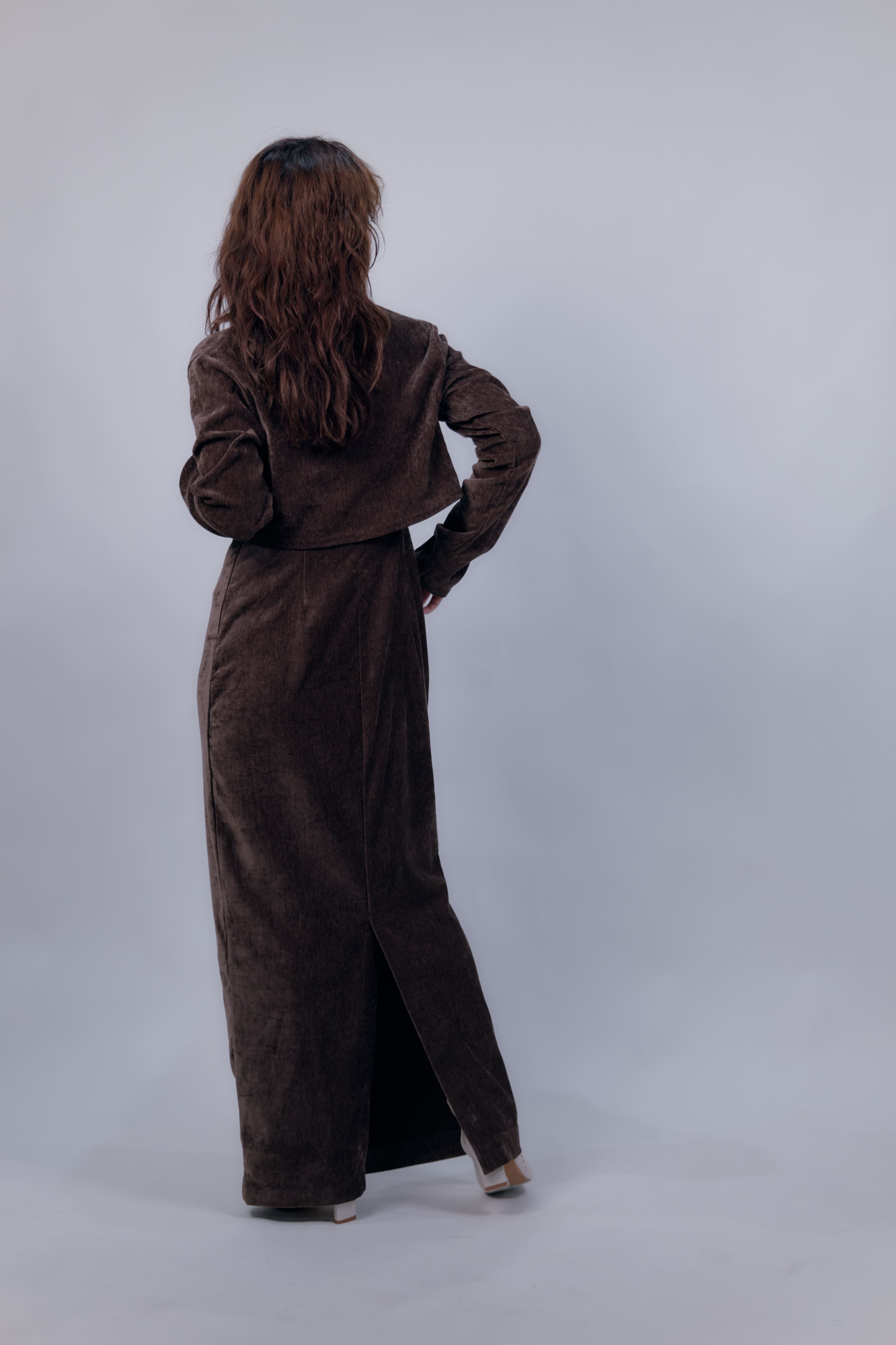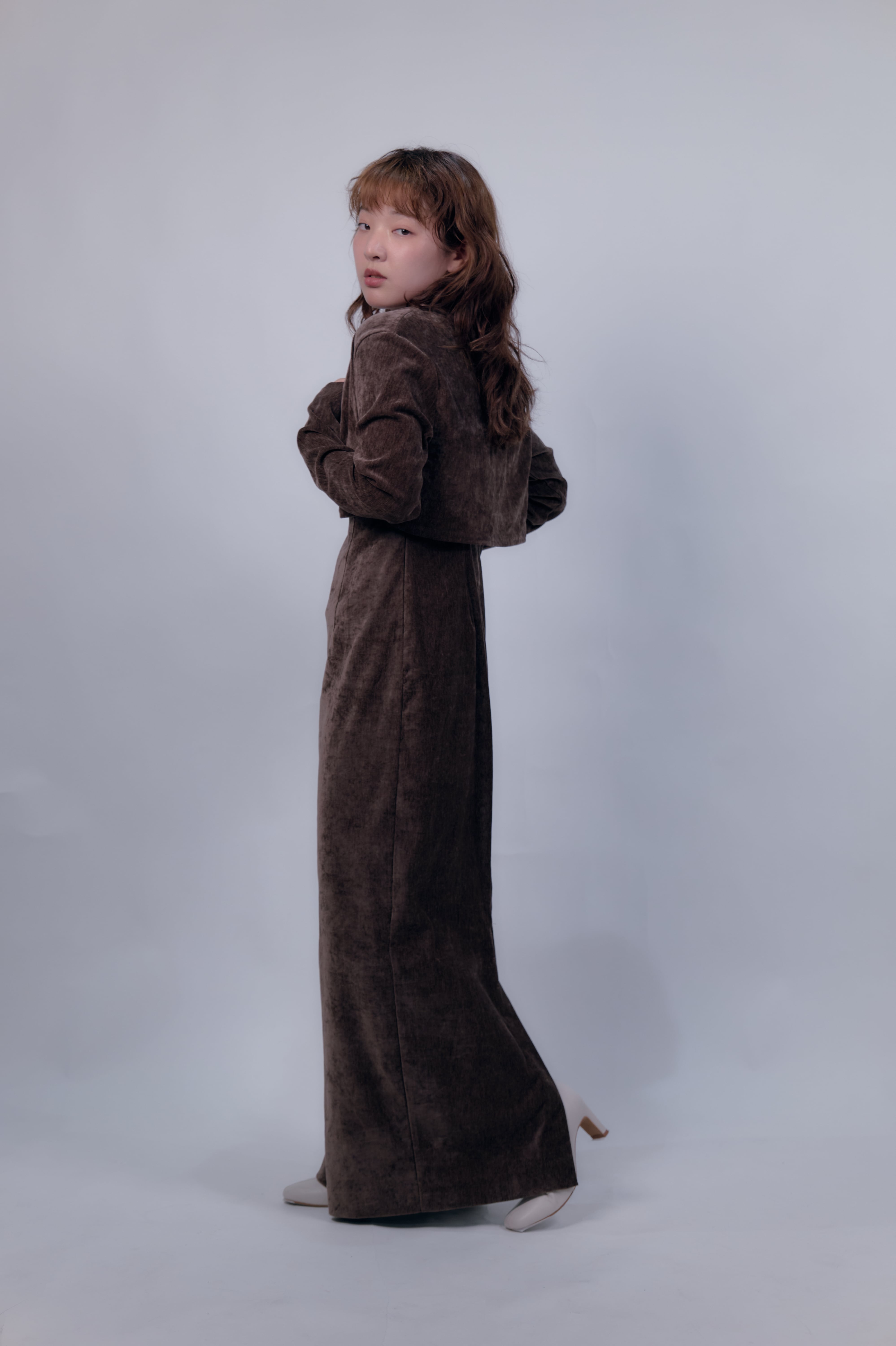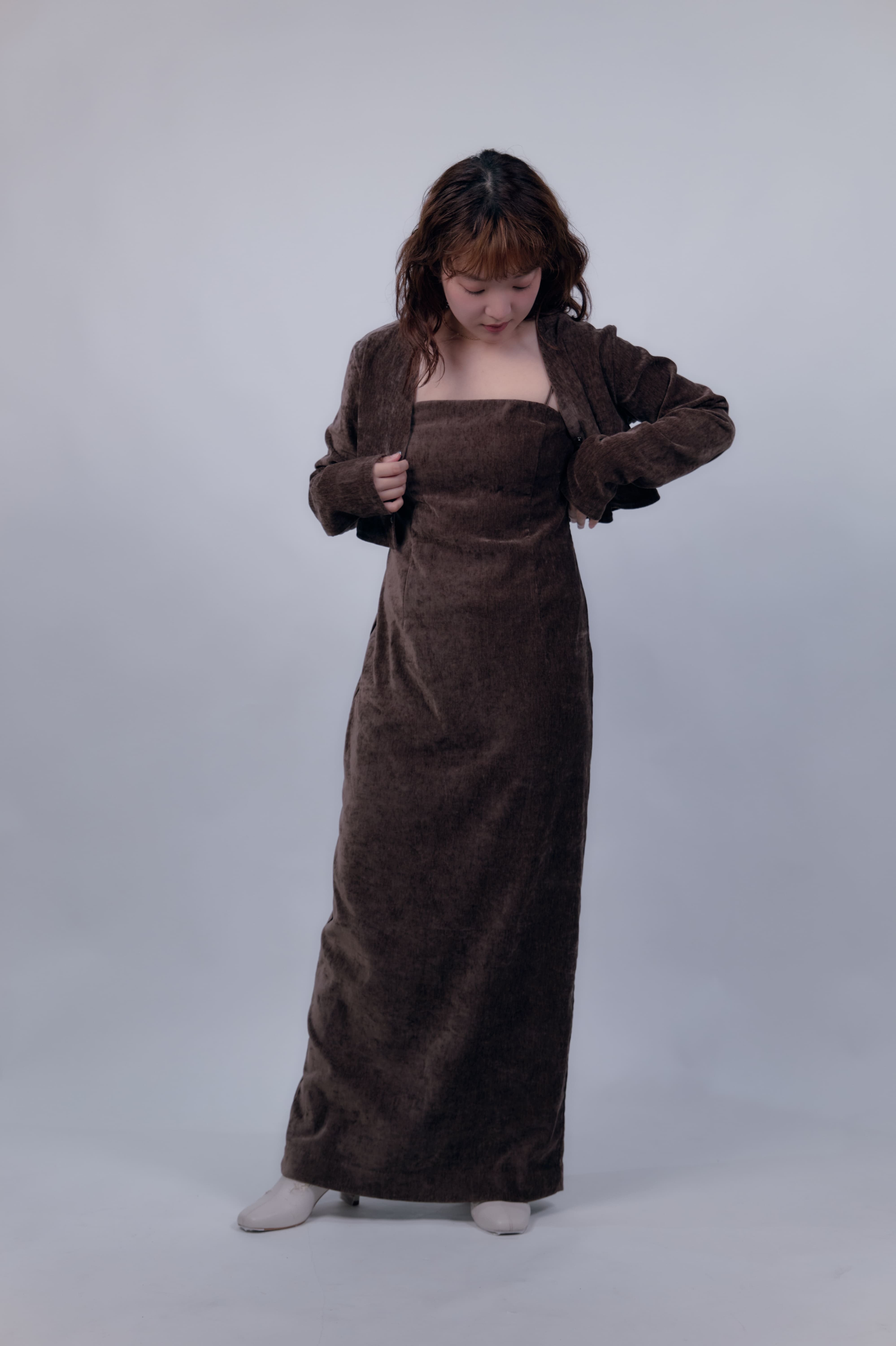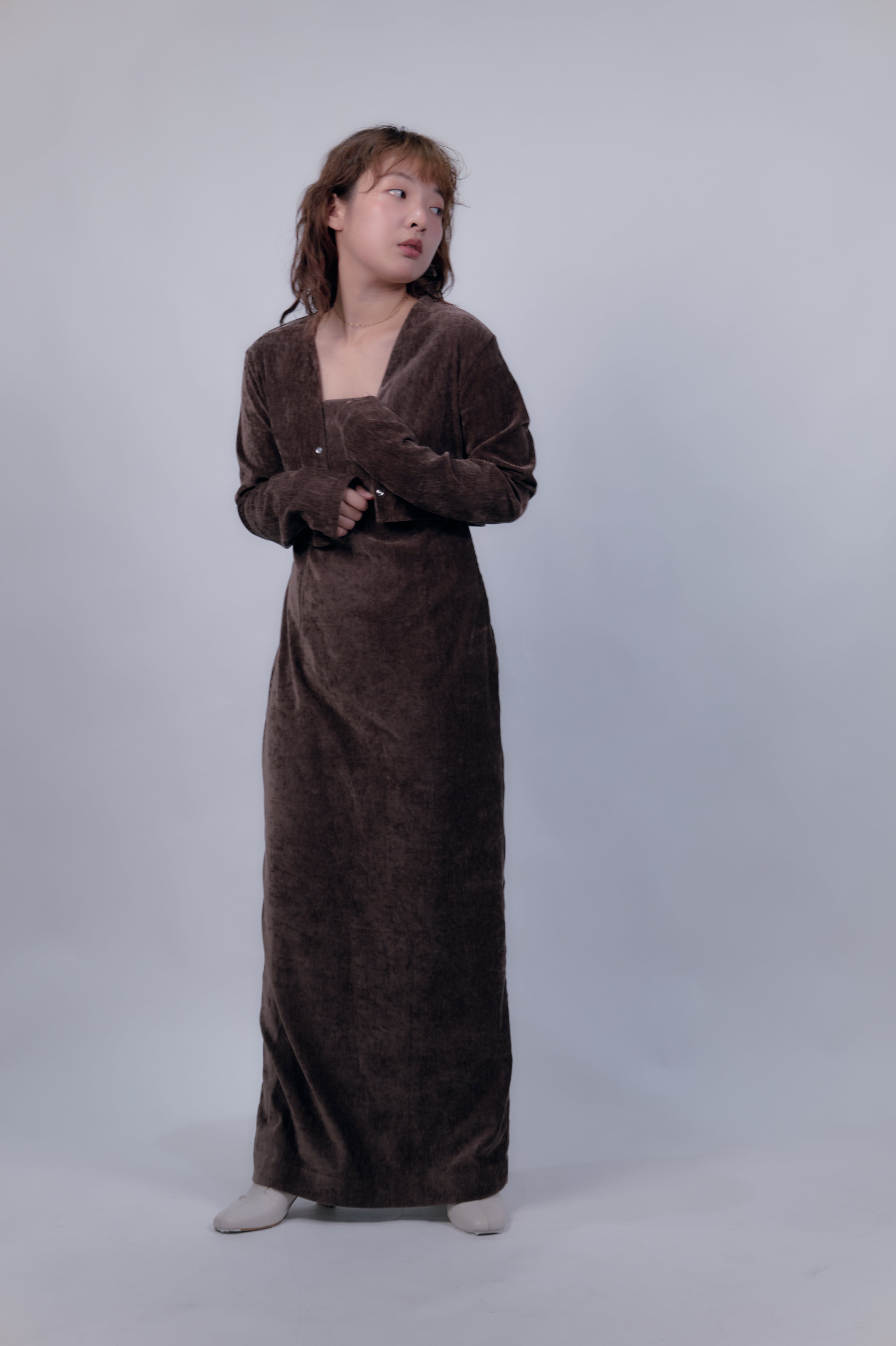 やわらかな光沢を放つベロアが、動くたびに表情を変えるセットアイテム。コンパクトなカーディガンとワンピースの組み合わせが、日常に静かな上品さを添えます。手触りに宿るぬくもりと、シルエットの程よい抜け感。やさしく包みながら、今日という一日を軽やかに歩ませてくれる1着。