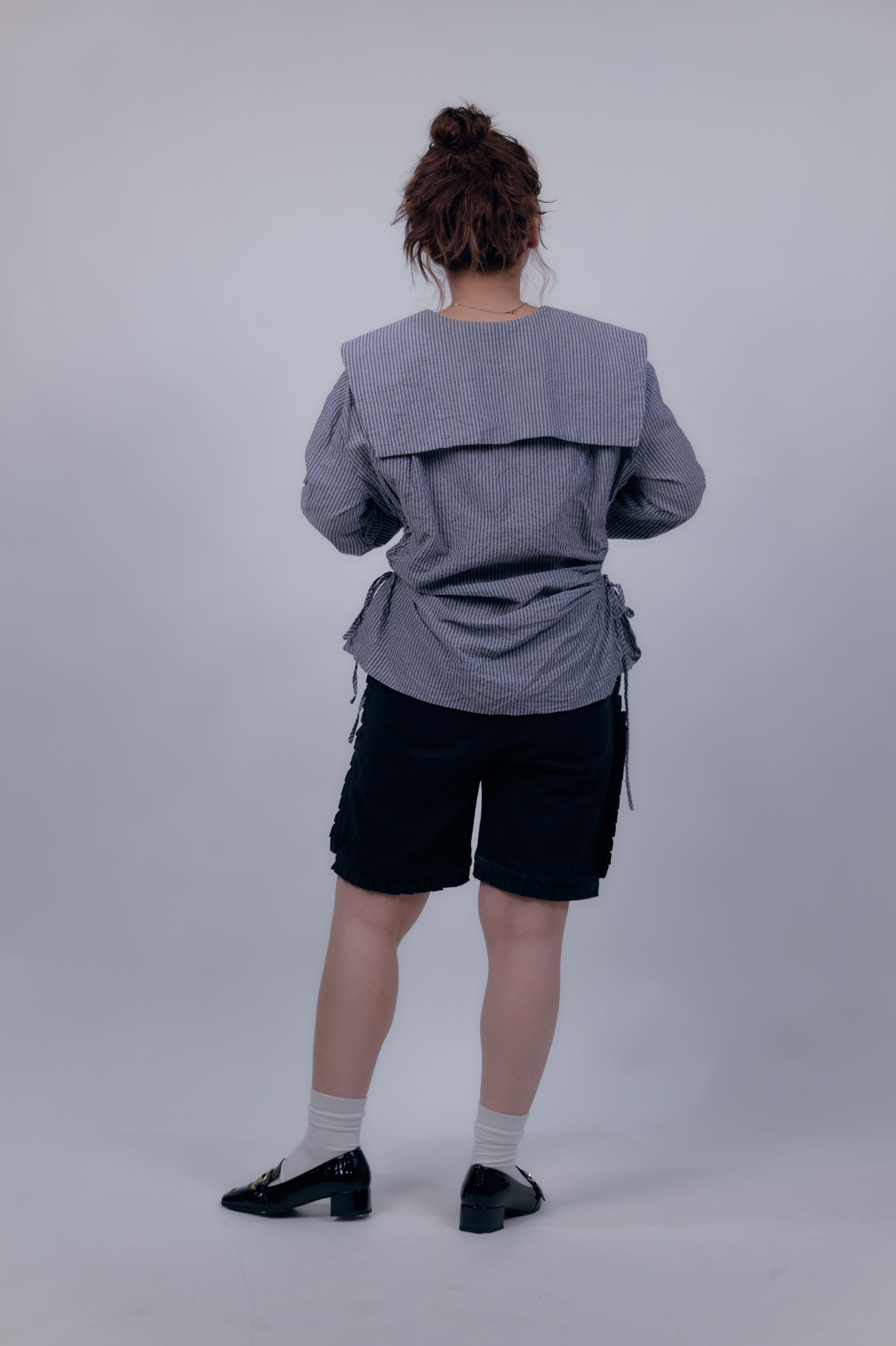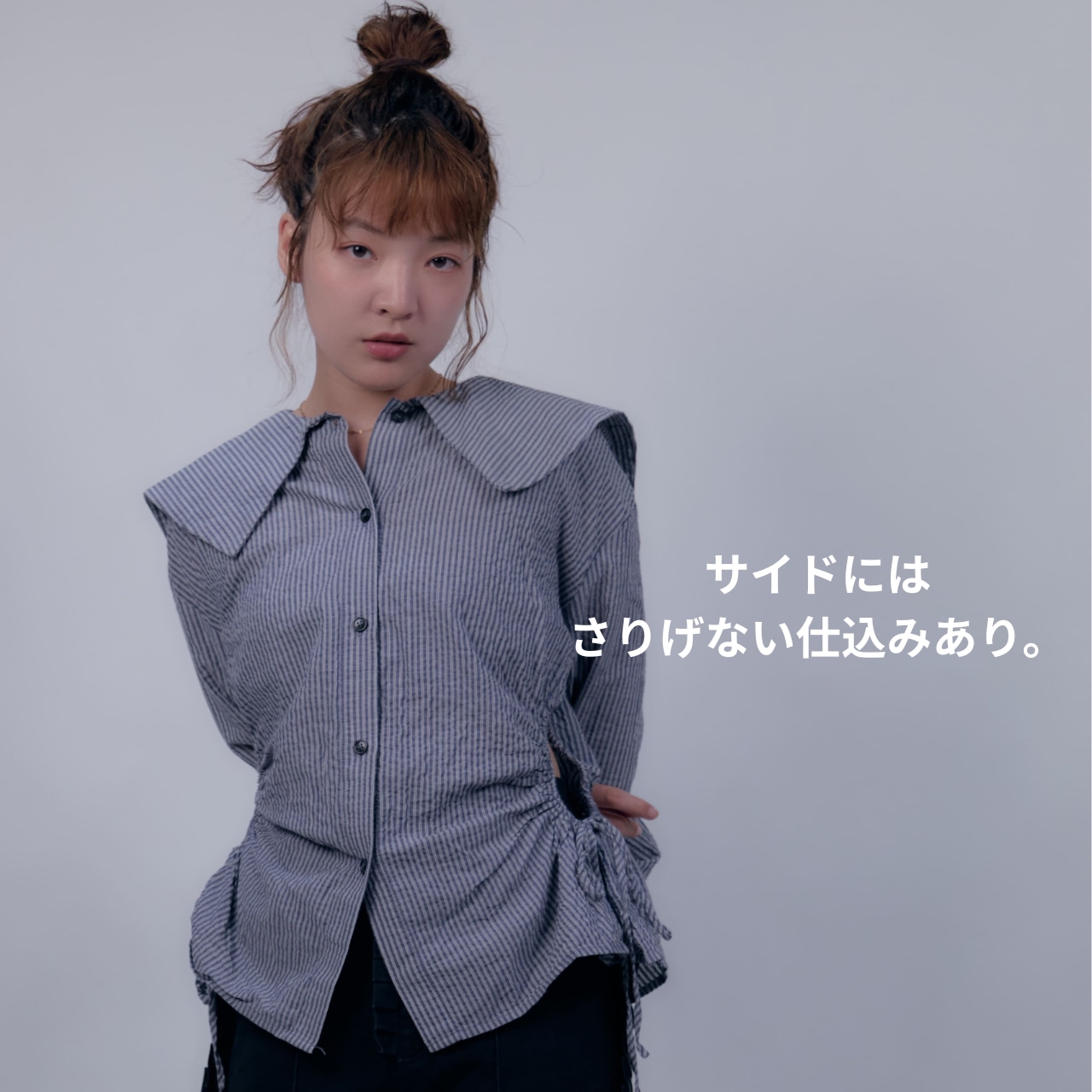 かちっとした服装にも抜け感が上手なみおさんから受け継いだ1着。正面から見ると、優しい柔らかなブラウスですが、横に目を向けると小さなリボンとちらっと肌見せ。