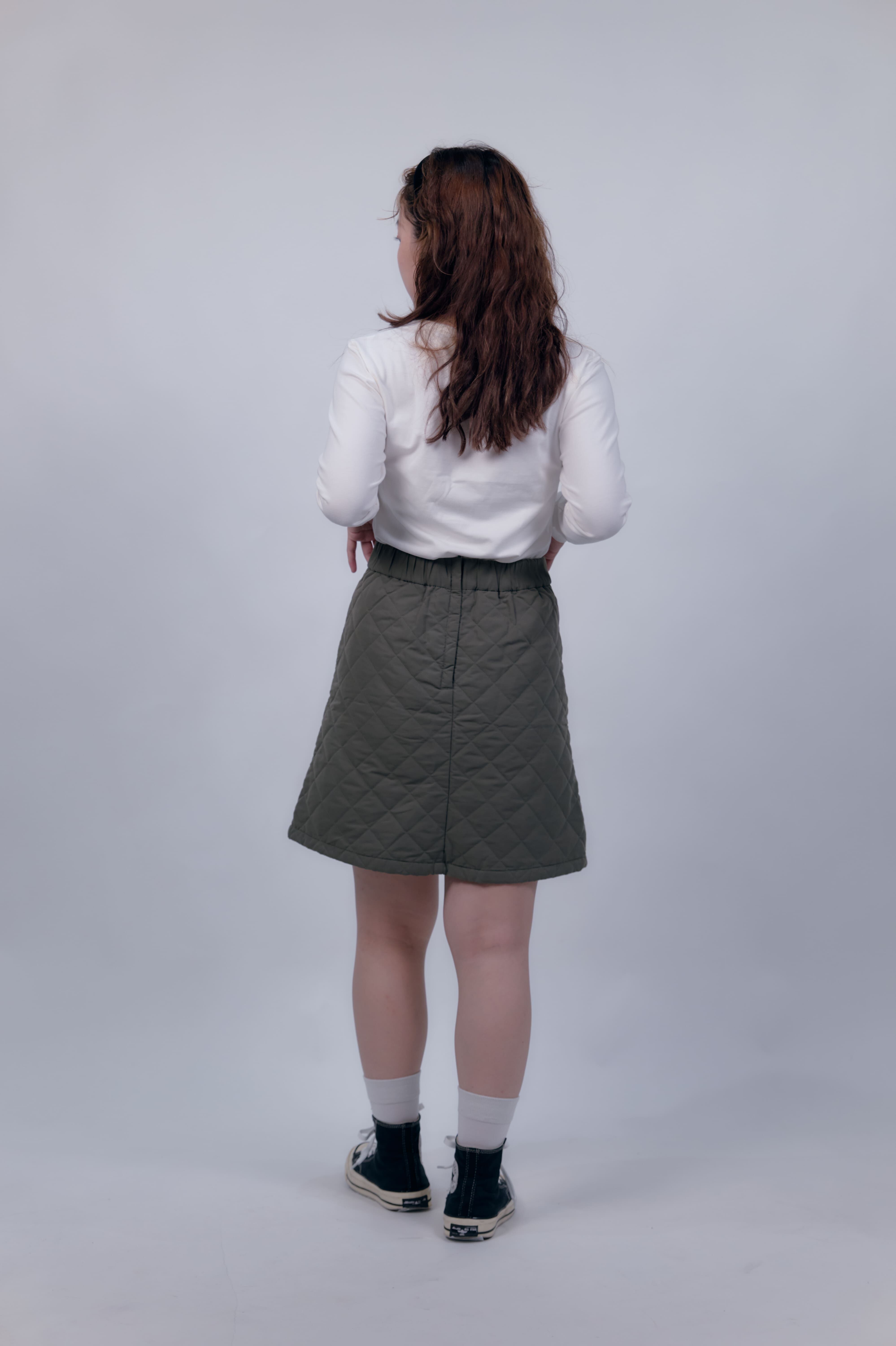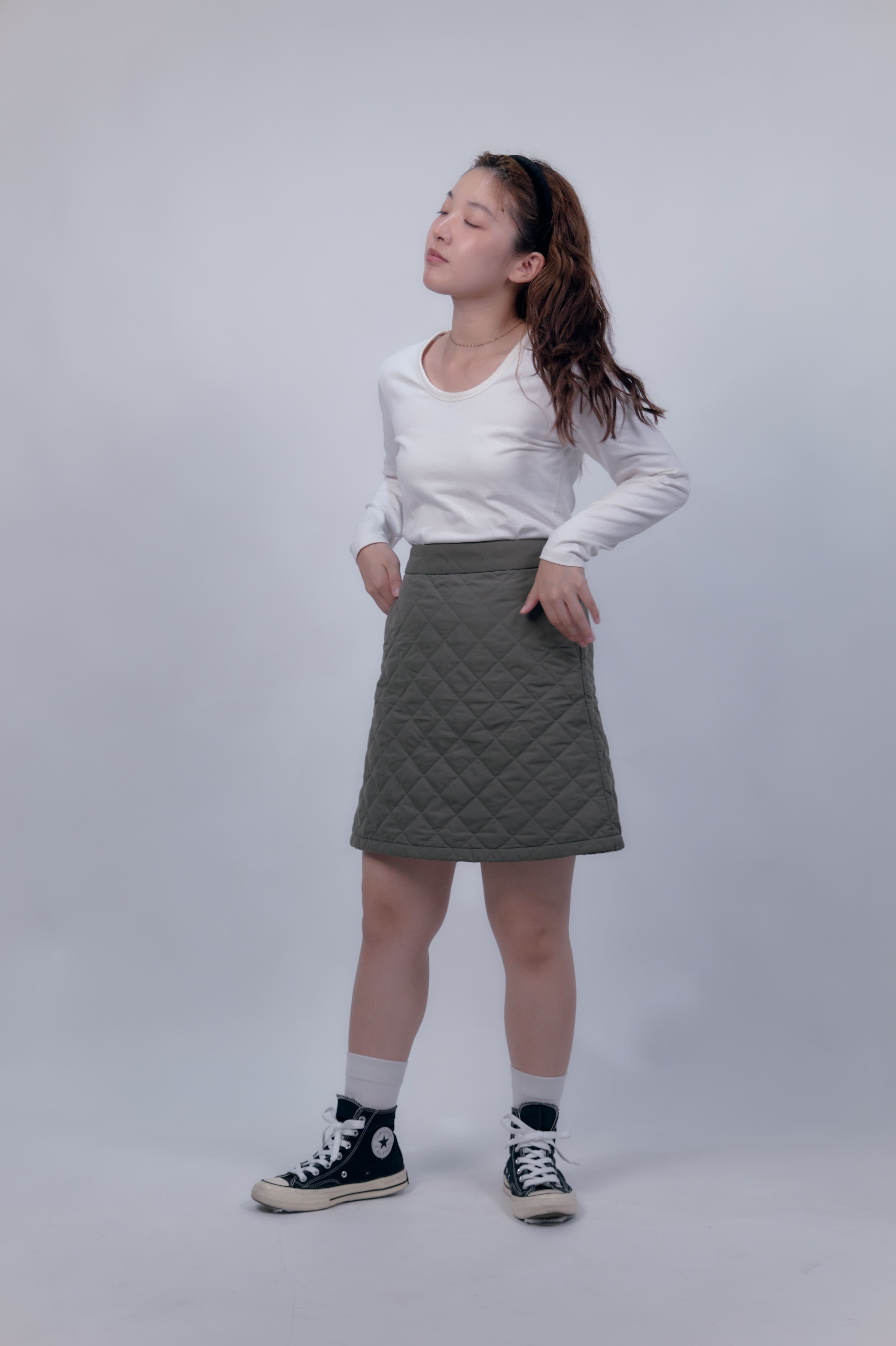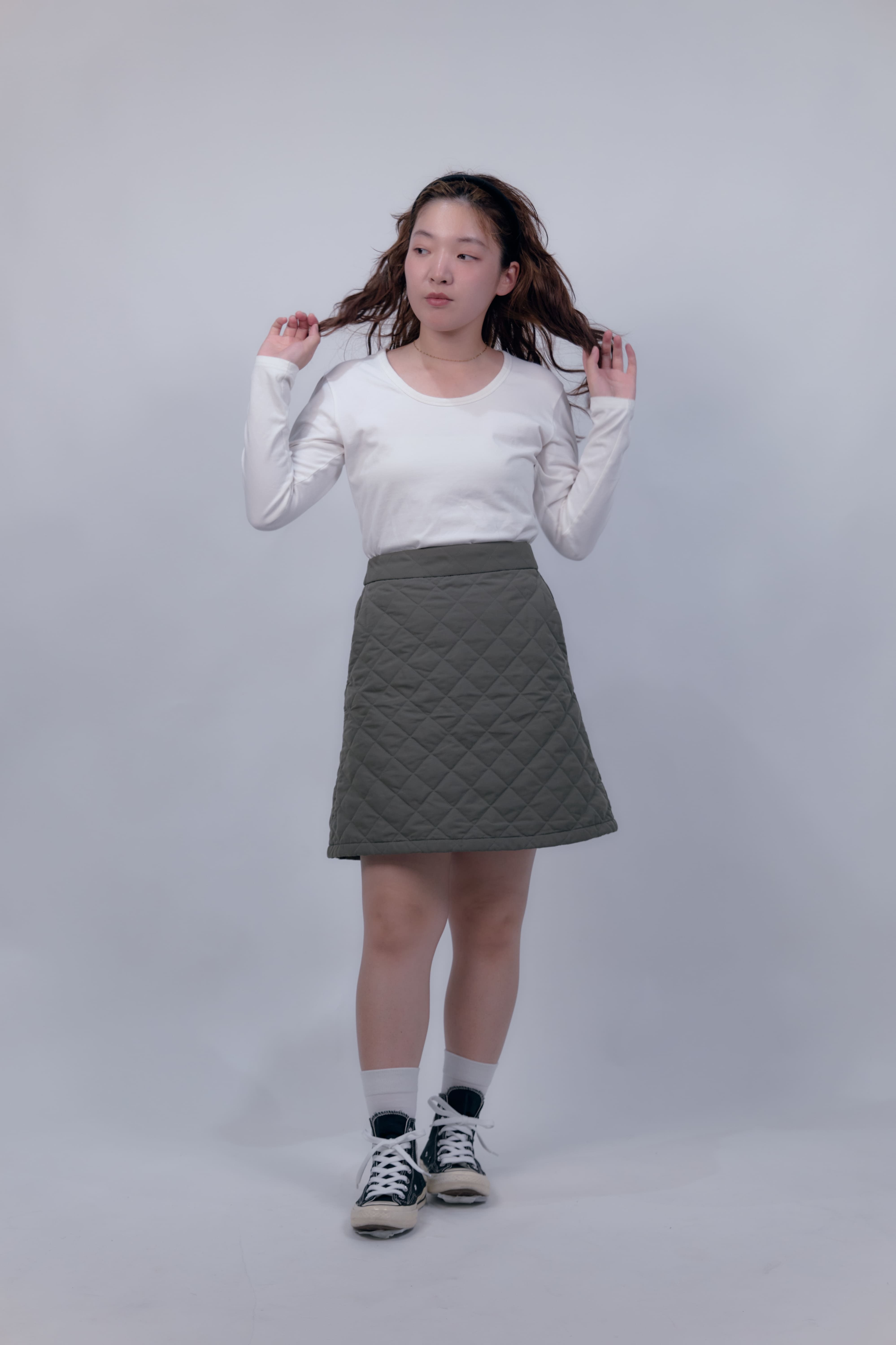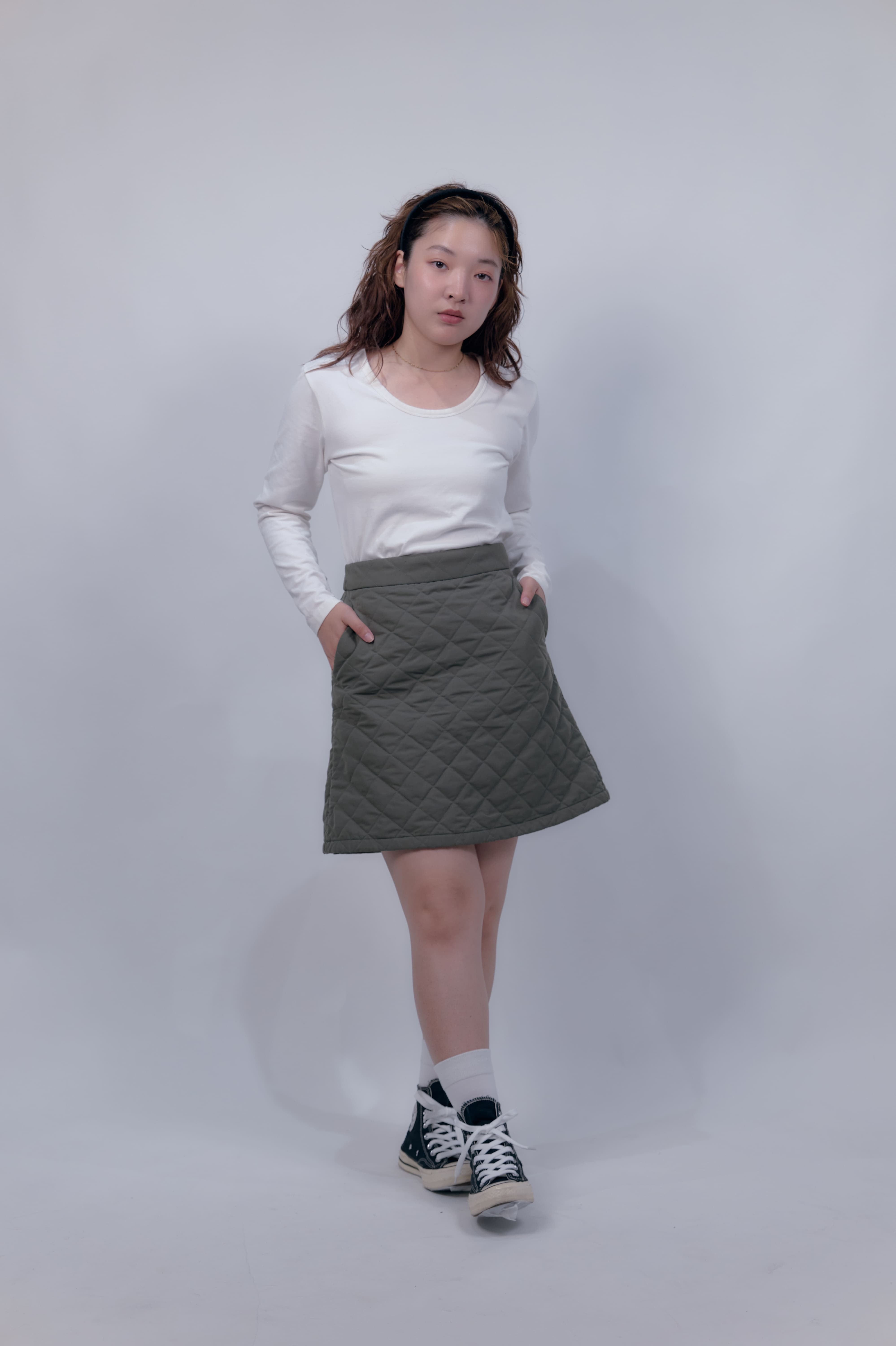 アパレル店員の経験から、どんなジャンルでも自分らしいコーデにするのが得意なひみちゃんから受け継いだ1着。彼の実家に結婚のご挨拶に行った時に着ていた思い出の1着だったそう。コロンとしたフォルムが愛らしいキルティングスカート。キルティング生地のスカートが肌触り良く、シンプルなトップスに合わせても存在感抜群。カーキ色がどんなコーディネートにも合わせやすいです。