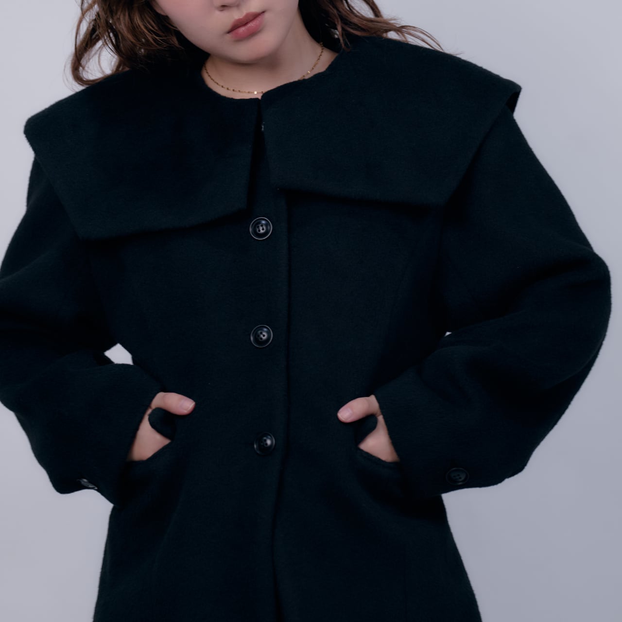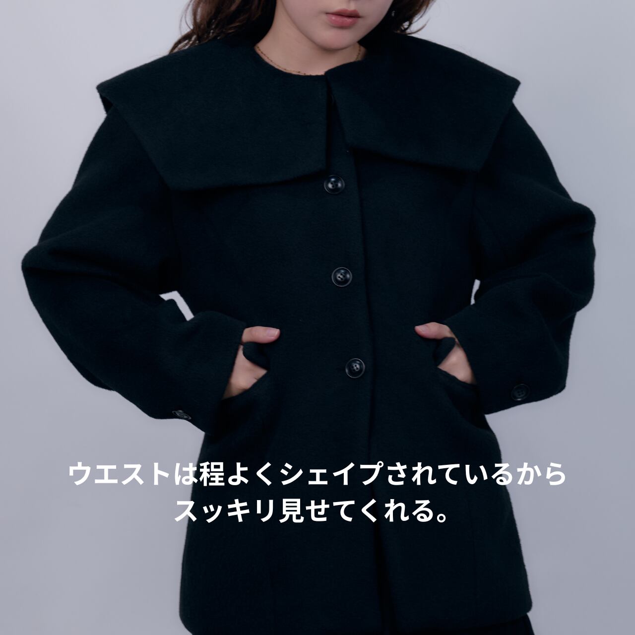 街の中でも自然と目を惹く、感度の高いみおさんから受け継いだ1枚。新品タグ付き。堂々としたビッグカラーが印象的な、モードでクラシカルなコート。シンプルな中にも存在感があり、羽織るだけで上品さと自信を与えてくれる。