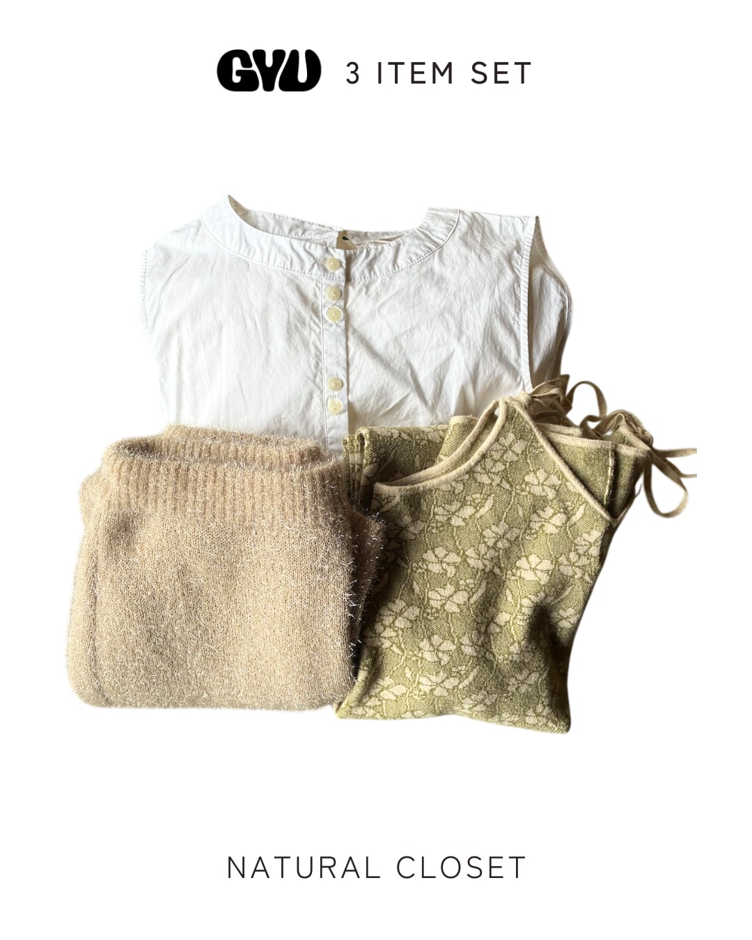 白やベージュのやわらかな色合いに、ゆったりした素材やシルエットの、きれいめナチュラルな3着を集めました。